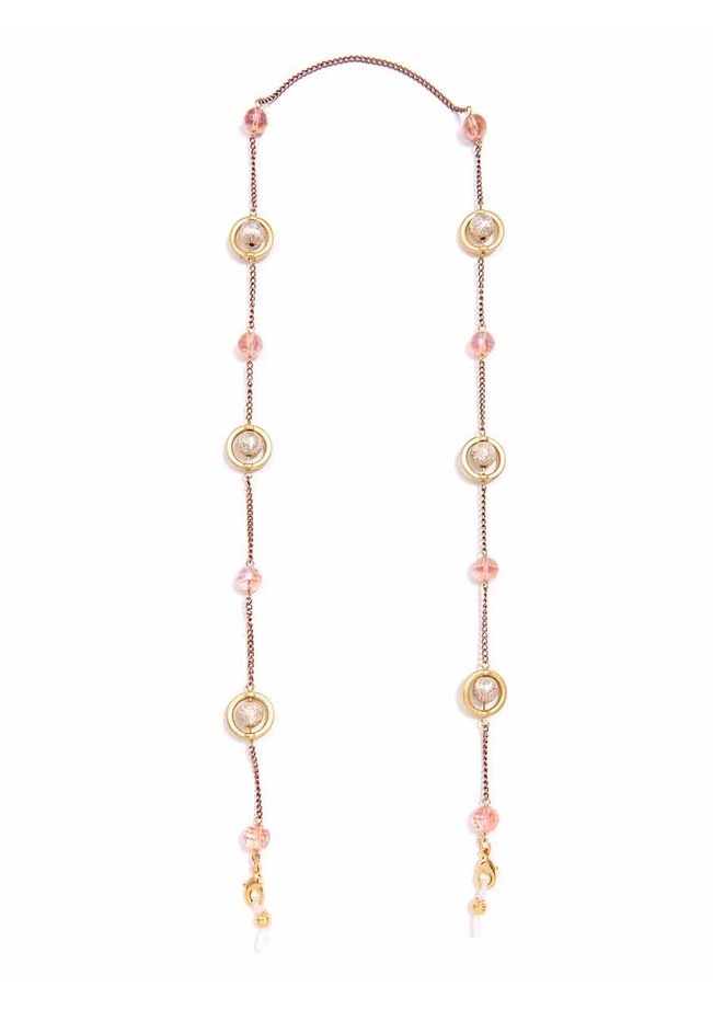 Crystal drops accent this convertible mask chain that comes with clear rubber loops to fit any pair of glasses and lobster clasps for clipping onto any mask. Can also be worn as a necklace.