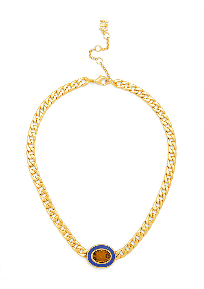18K gold-plated curb chain collar necklace embellished with an enamel-enclosed crystal charm.