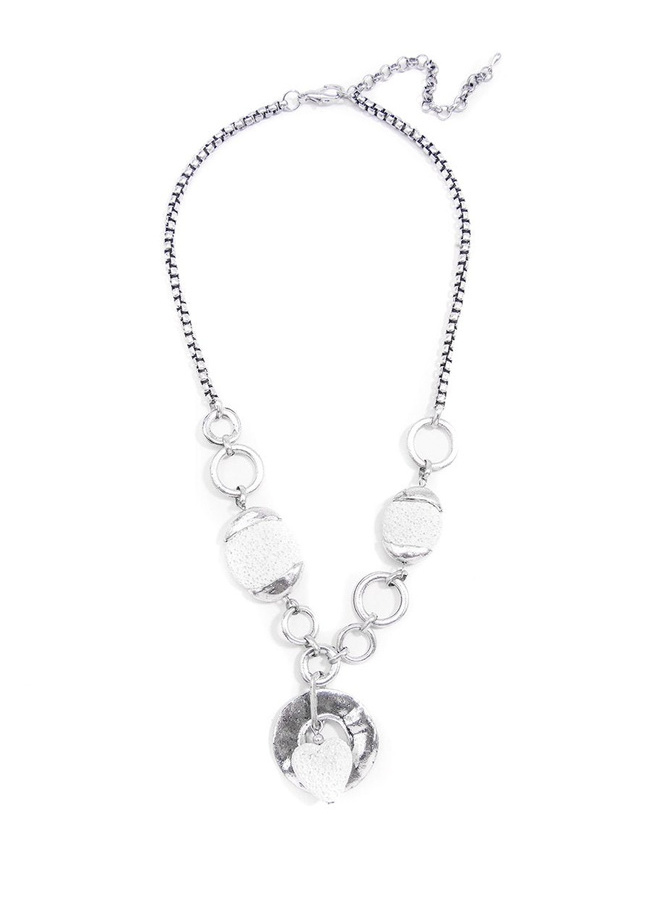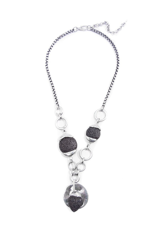 Long, burnished metal necklace with hoop and perforated stone pendants.