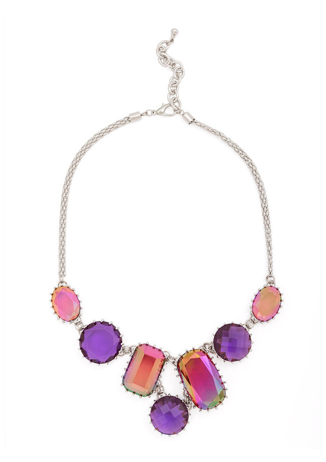 Statement necklace composed of seven oversized pink and purple crystals bursting with vintage-inspired sparkle.