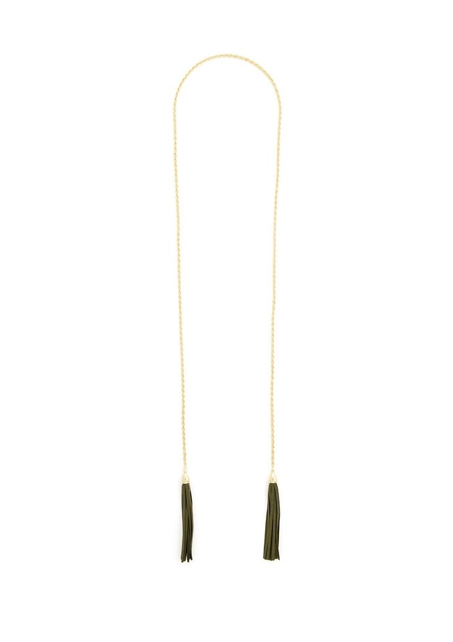The delicate gold chain with suede tassels can be tied or just wrapped. Swing knot to the back makes for a sassy surprise.