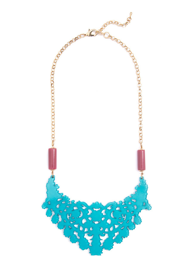 Classic lace takes a twist with this laser cut resin bib necklace in a variety of colors.