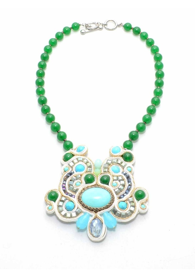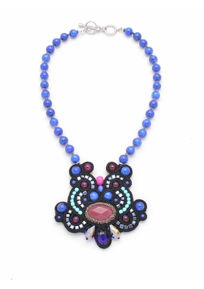 Inspired by worldy fashion, this beaded beauty features intricate detailing, fabric, and a toggle clasp.