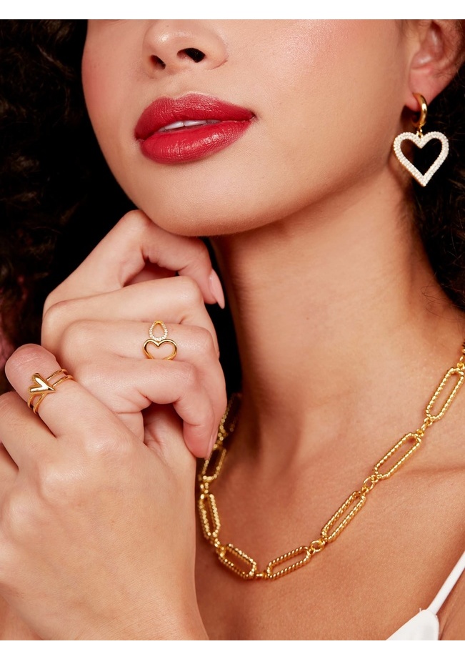 This adjustable ring is plated in 18K gold/rhodium and features a double band and open heart design.