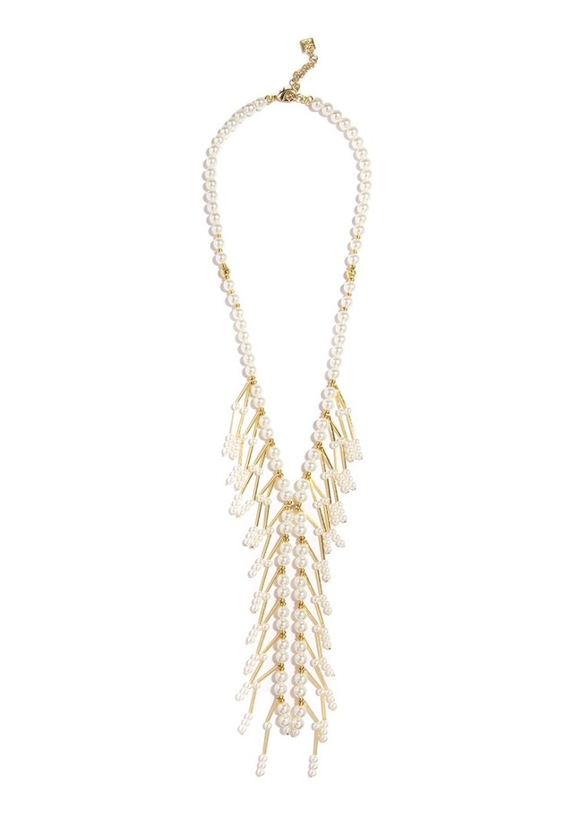 Long pearl necklace with 8 inch intricate pearl and gold bar tassel drop.